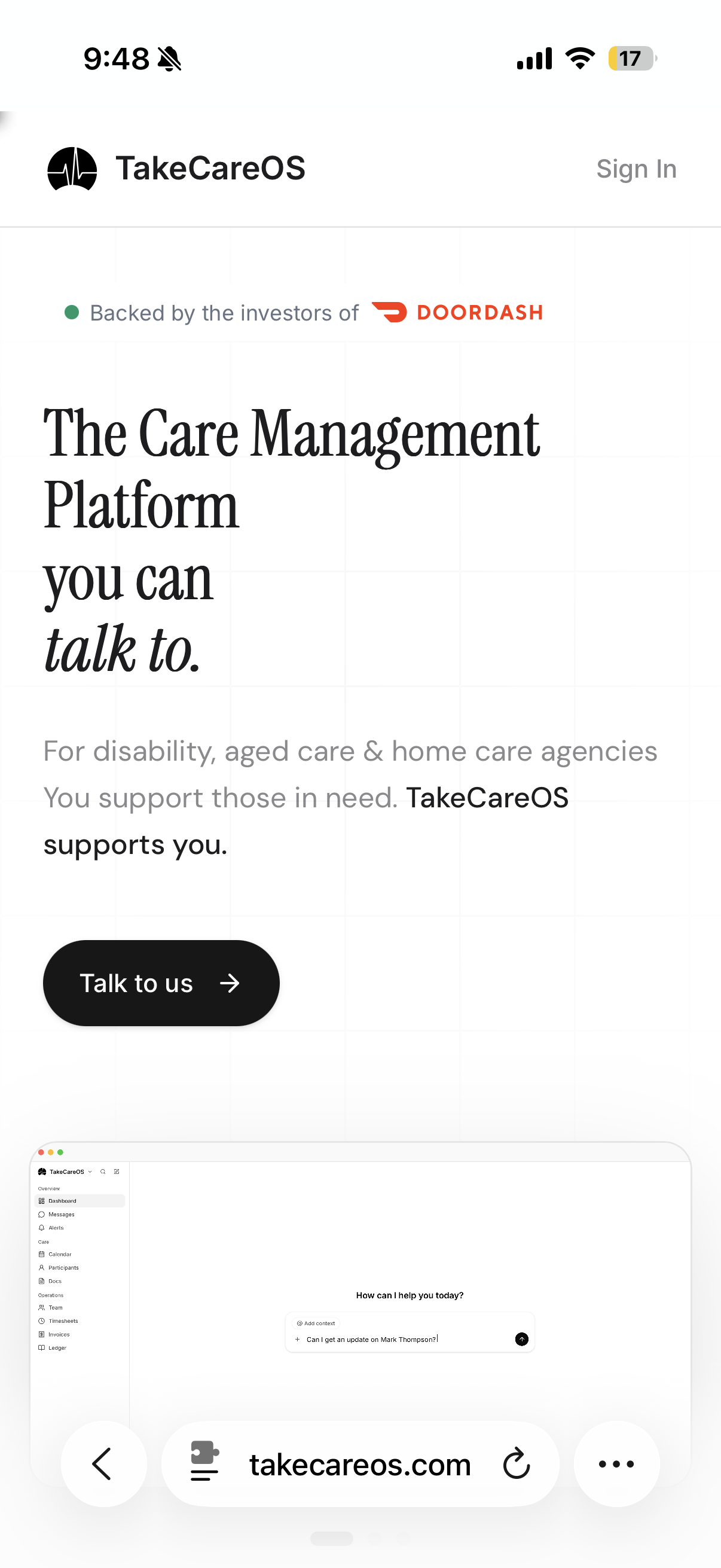 TakeCareOS works like a native app on your phone. Follow the steps below to add it to your home screen — no app store needed.