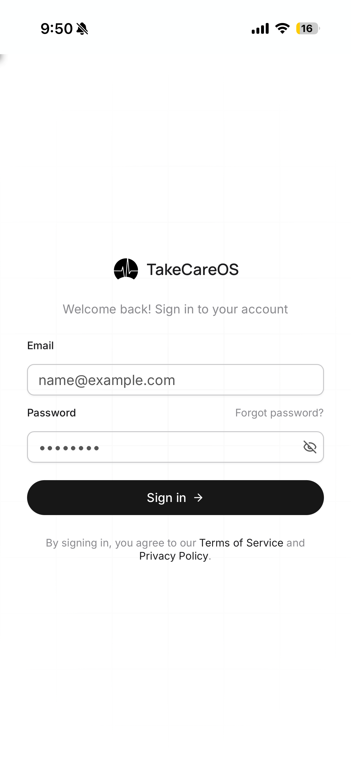 Open TakeCareOS from your home screen and sign in with your account credentials.